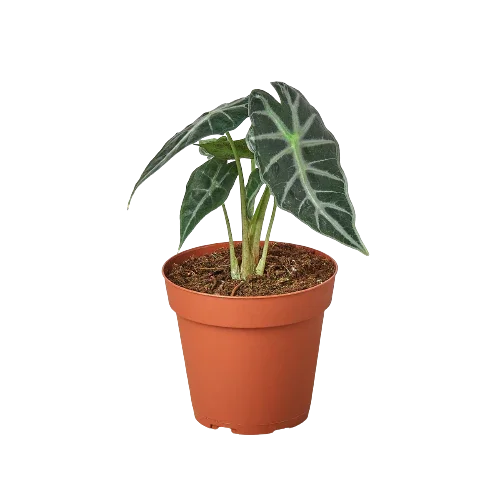 The Alocasia Amazonica 'Bambino' has sleek, sharp, green leaves with bold white veins and a burgundy underside. This quirky houseplant is not for the faint of heart, as it requires constant watering and plenty of bright, indirect sunlight to thrive. Beware, it is also not pet-friendly and is extremely cold-sensitive.
