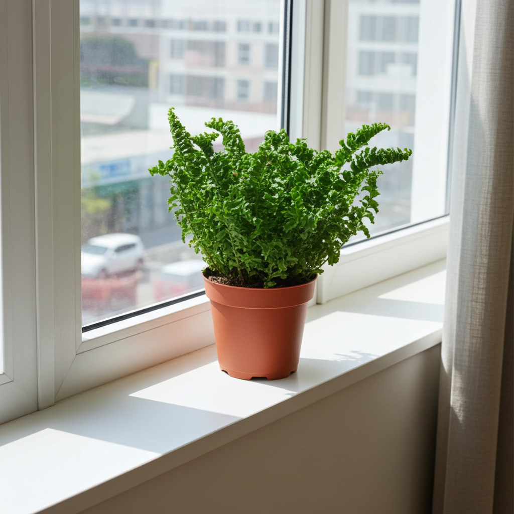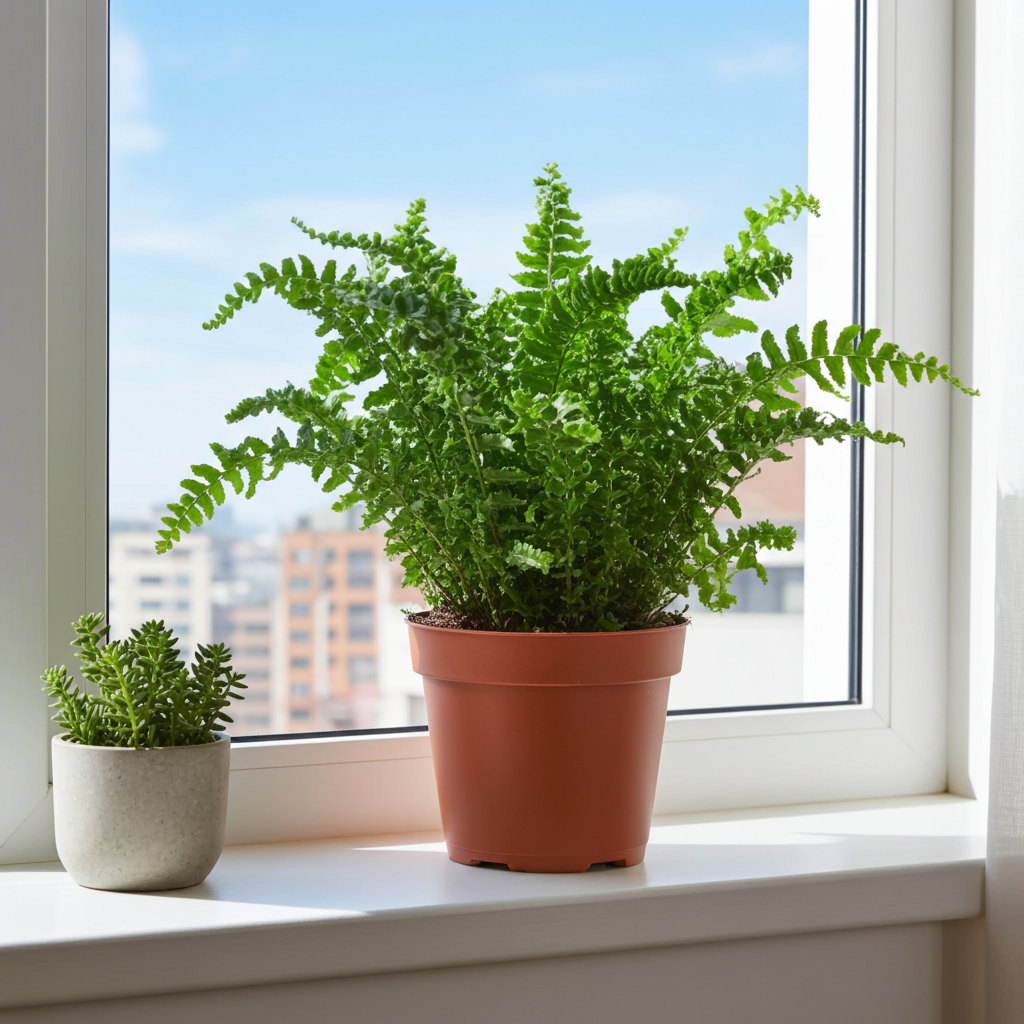 * Description: The Emina fern has many soft and fluffy light-green leaves that flare up and outward as they grow. At full maturity, this fern can grow to be up to 5 feet tall. Like most ferns, it thrives in partial shade and indirect sunlight, moderate indoor temperatures, and moist but well-drained soil. Its vibrant green leaves make it a popular choice for hanging and pedestal displays.