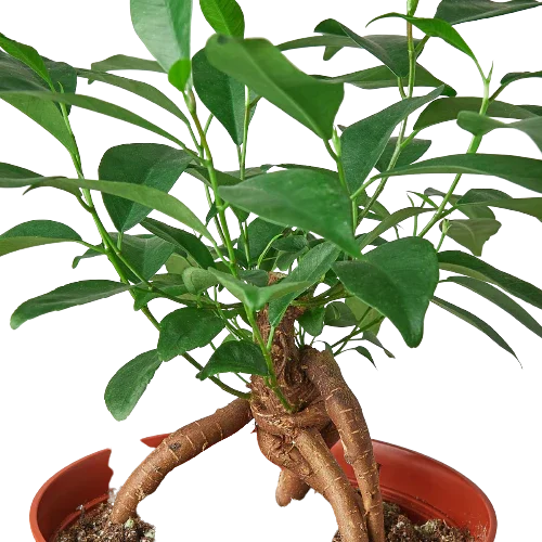 - Description: Native to Asia and Australia, Ficus 'Ginseng' is a cultivar used extensively in bonsai for its bulbous, thick roots reminiscent of ginseng that rise out of the ground and has small evergreen leaves and is a popular houseplant for its ease of care and elegant growth. Although the Ficus plant grows naturally in lowland tropical forests, it can thrive in a large range of environments. In its natural habitat, this ficus grows to a large and stately tree up to 100ft tall, so indoor growing may require pruning. Although it was determined that Ficus Ginseng is effective at removing common household air toxins formaldehyde and xylene, it is also a source of allergies, especially for people allergic to latex. Not recommended for pet owners.