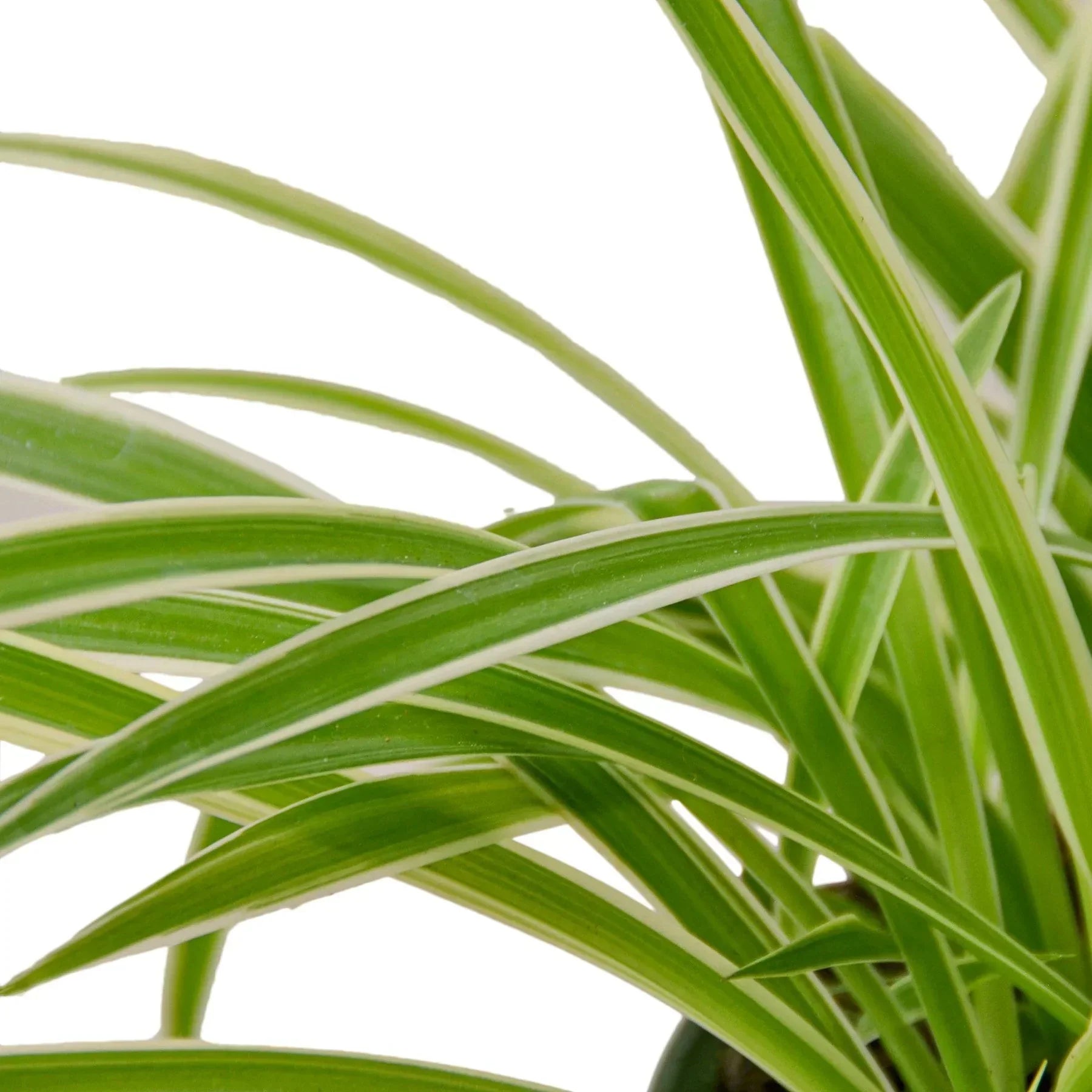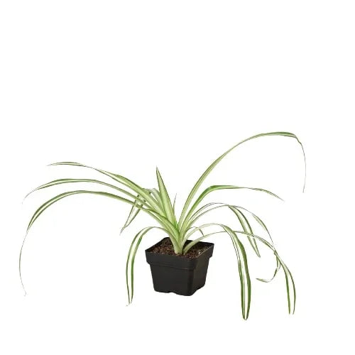 - Description: The Spider plant is a flowering perennial native tropical South Africa. The leaves of the spider plant are thin ribbon like strands which end in a point and grow upward and bend downward giving it the look of a spider, this particular variety will have leaves which grow outward and upward.The Spider plant produces small white flowers that grow along a long stalk independent to the leaves of the spider plant. Also known for their air purifying qualities,the spider plant is a great companion to any household of office.